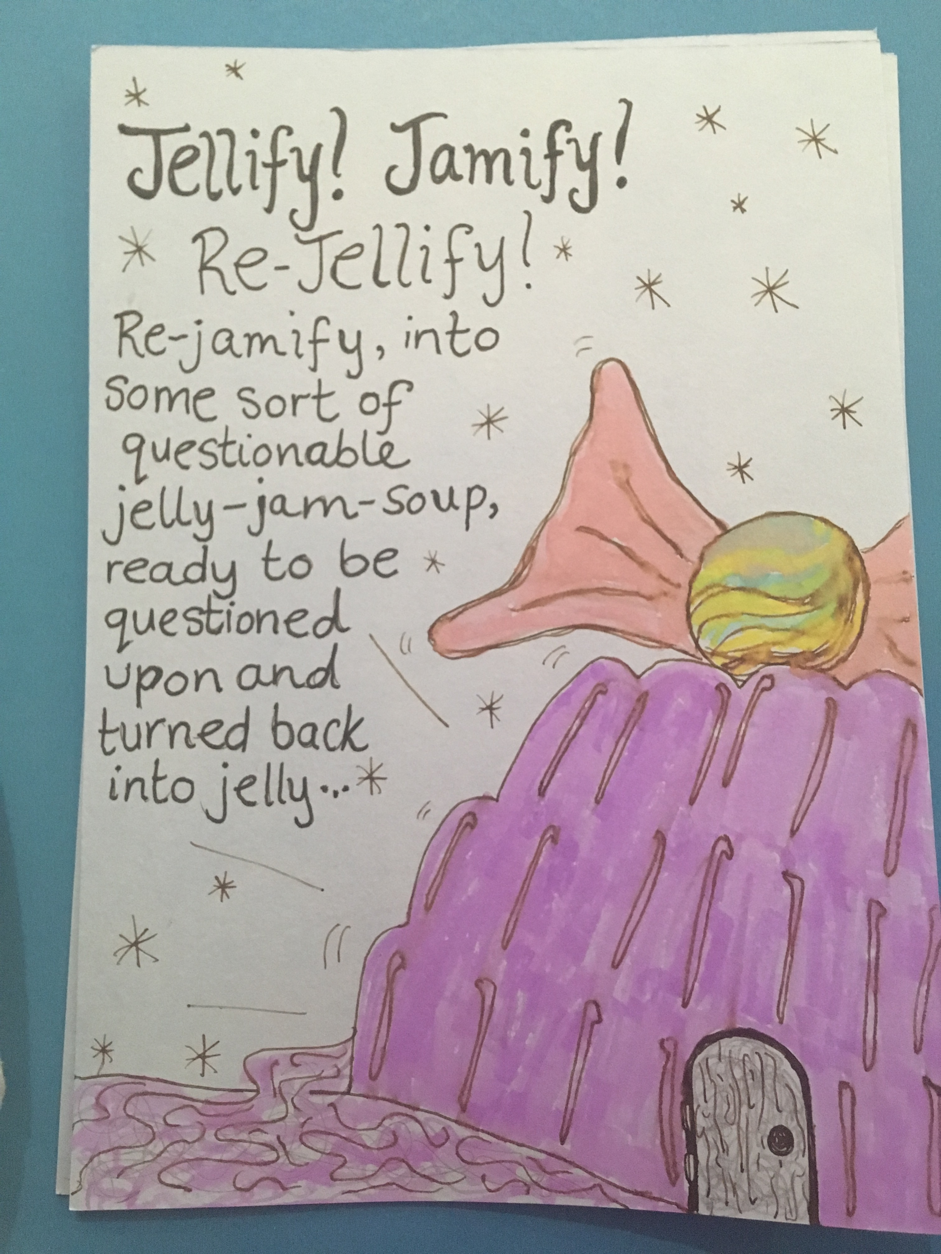Also in December, I had my first university assessment, which was a presentation. I was extremely nervous about this, as usual, but it had also turned into an obsession (I still have the poster that I made at the start of my planning). I wrote a big thing out and stared at it every single day for hours, but then all sorts of things go wrong that you can’t predict and it doesn’t help when you’re so so nervous you think you’re going to be sick every time you remember what you’re doing. My presentation was about performance of inner selves giving permission to be; I discussed my own inner worlds as well as other creative people who used characters to perform or express through. I definitely learned that I would benefit from practicing out loud, because although I whispered it to myself for hours repetitively, I discovered that speaking is VERY different to whispering! I also learned that the next time I have a presentation, I need to make myself have speaking-out-loud conversations with people in the days leading up to it, definitely the day before it – even if it’s just the night before it. I was having days of not speaking out loud and the weekend leading up to the presentation I think I had 2-3 days not leaving the flat due to intense anxiety (which then makes it harder to leave the flat, and increases anxiety, of course). I think even if I’d made myself phone someone the night before it might have helped – that’s easier said than done, especially when you factor in the anxiety I was having at the time, but I know for next time to at least try. HOWEVER, despite me feeling like EVERYTHING had gone wrong with the presentation (it turned out it hadn’t been completely disastrous like I’d thought, it was just went very differently to how I had planned, which I was Very-Not-Impressed-About), what happened directly afterwards was unexpectedly positive: the performance of my presentation had inadvertently given me permission to be; I was IndoorGoblin, Sumita and all of the rest of me, and I felt… free. (I forgot to mention I went to uni as IndoorGoblin that day – public transport with a purple face is great fun). I got to my next class and, after a whole term of making it my mission to say something every week out loud in class, even when I felt uncomfortable to do so, I suddenly felt like something else was talking through me… I was commenting on everyone’s presentations in free-form, as in, not planning out what I was going to say in my head first and forcing myself to say it… and I even gave a 5 minute totally unplanned presentation using some weetabix-shapes I drew up on a powerpoint, talking about language-communication/translation of brain things, using the model of what it’s like when my brain counts weetabix to keep me calm or to keep my brain-shapes feel organised. (It probably went better than the one I’d obsessed over for weeks – but this one wasn’t assessed!) That was my last day of term… I’ll always remember my journey through that module. It proved to me that I could be the kind of student I never thought I could be; I proved to myself that I WAS that person, when the circumstances aligned to support me to be so – even when things didn’t go like I wanted to. I wondered where the experience would take me next.