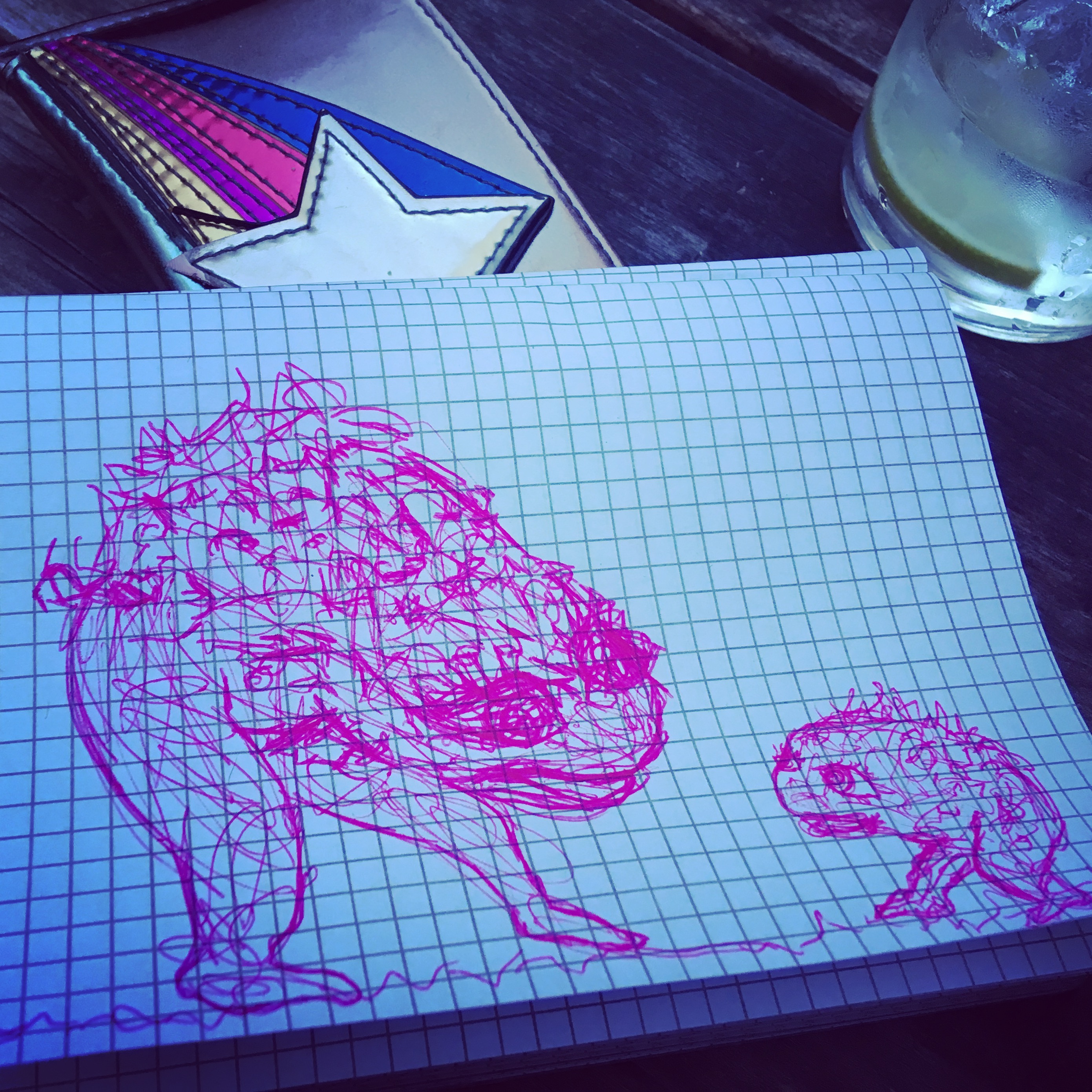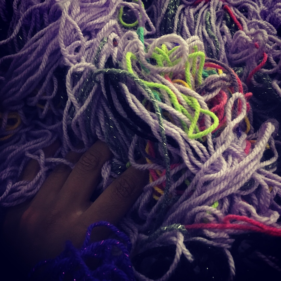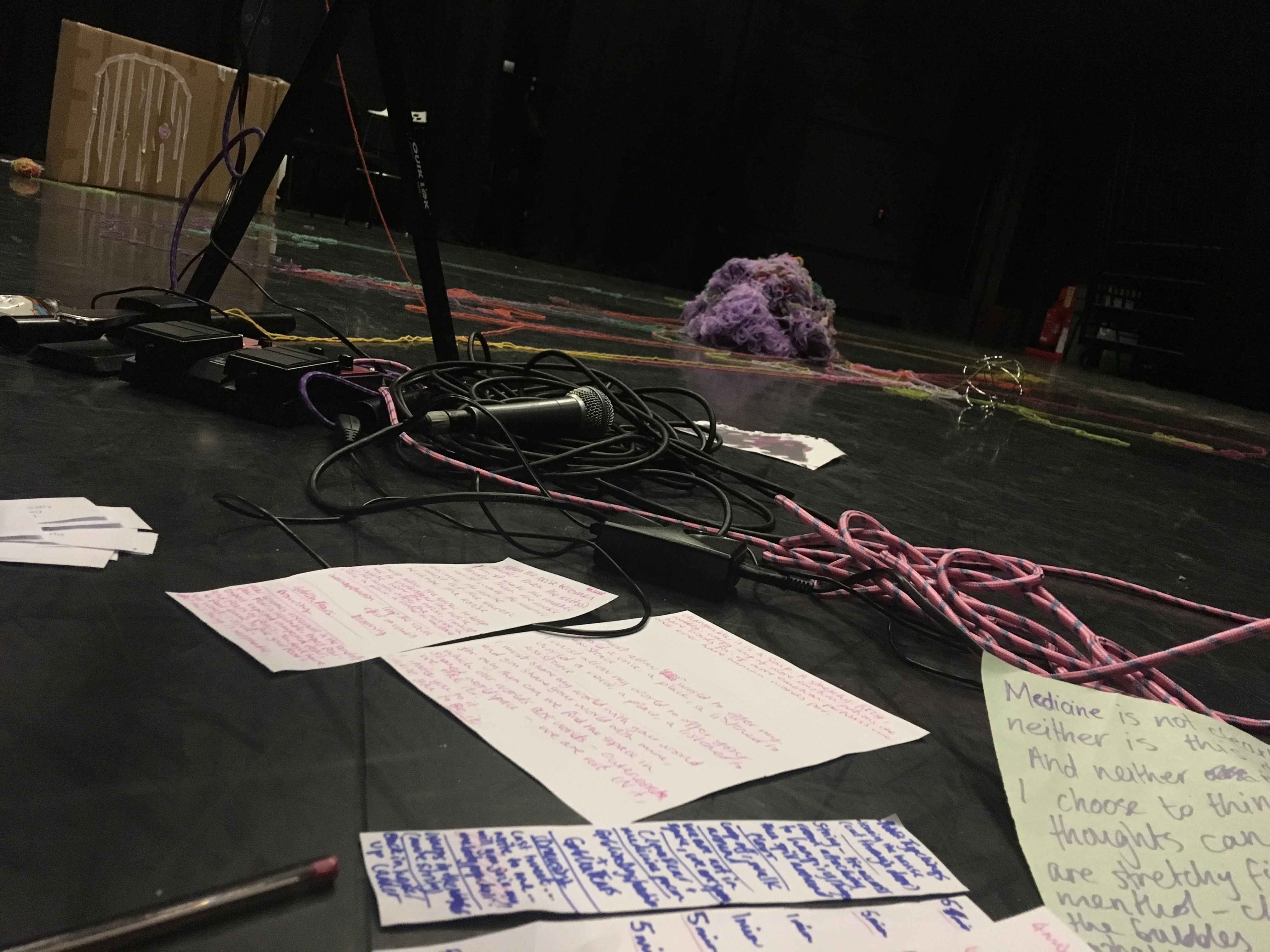 By obsession-loop, I mean I cannot stop thinking about this module, I see everything through the lens of this module – and that doesn’t mean it’s always productive, because I will get stuck on just going over and over and over a tiny thought about it in my head. I want to write about it but it’s actually really difficult because I’m only just realising that not everyone can see and feel this which feels incredibly bizarre – it’s like all this time I have sort of expected everyone to know/be experiencing the last few weeks with me, as me – but everyone has their own planet-spheres in their heads and bodies and souls, it seems weird having to explain. but if I explain here it might help me to write about it, which I have to do tonight, so here we go. For this module I’ve been making a performance piece, an IndoorGoblin one, which at the moment is a combination of music and words and scribbles and fear and I’ll be playing with string because I like playing with string. I have never made a show like this before, so although I feel like I don’t really know what I’m doing, which is so very-terrifying, it so very-exciting to explore and play and see what happens – I don’t ever want to stop making stuff; I feel like I want to be able to climb into the song-spheres/scribble-spheres/whatever-else spheres, and have others climb into them too, as opposed to just standing there playing stuff. I have been spending time in the rehearsal room most days, which is interesting because I’ve spent so much time on my own in this tiny white room and then I go there and spend so much time on my own there in a bigger black room! Hours go by so quickly there, I feel so lucky to have the space to be creative in so I am making the absolute most of it while I can… and I figured out how to get (most of) the tech stuff working on my own which is VERY exciting for me – it took me so much practice of staring at the cable-spaghetti. I never know what’s going to happen when I go in, and something always does happen, and then I change the entire show – I’m constantly nervous because I know I keep changing it, so you’d think I’d keep it the same, but I’m constantly excited because I don’t know what’s going to happen (I think I get confused between the nervous and the excited…) There is just so much stuff I want to make, so much stuff I feel I NEED to make…