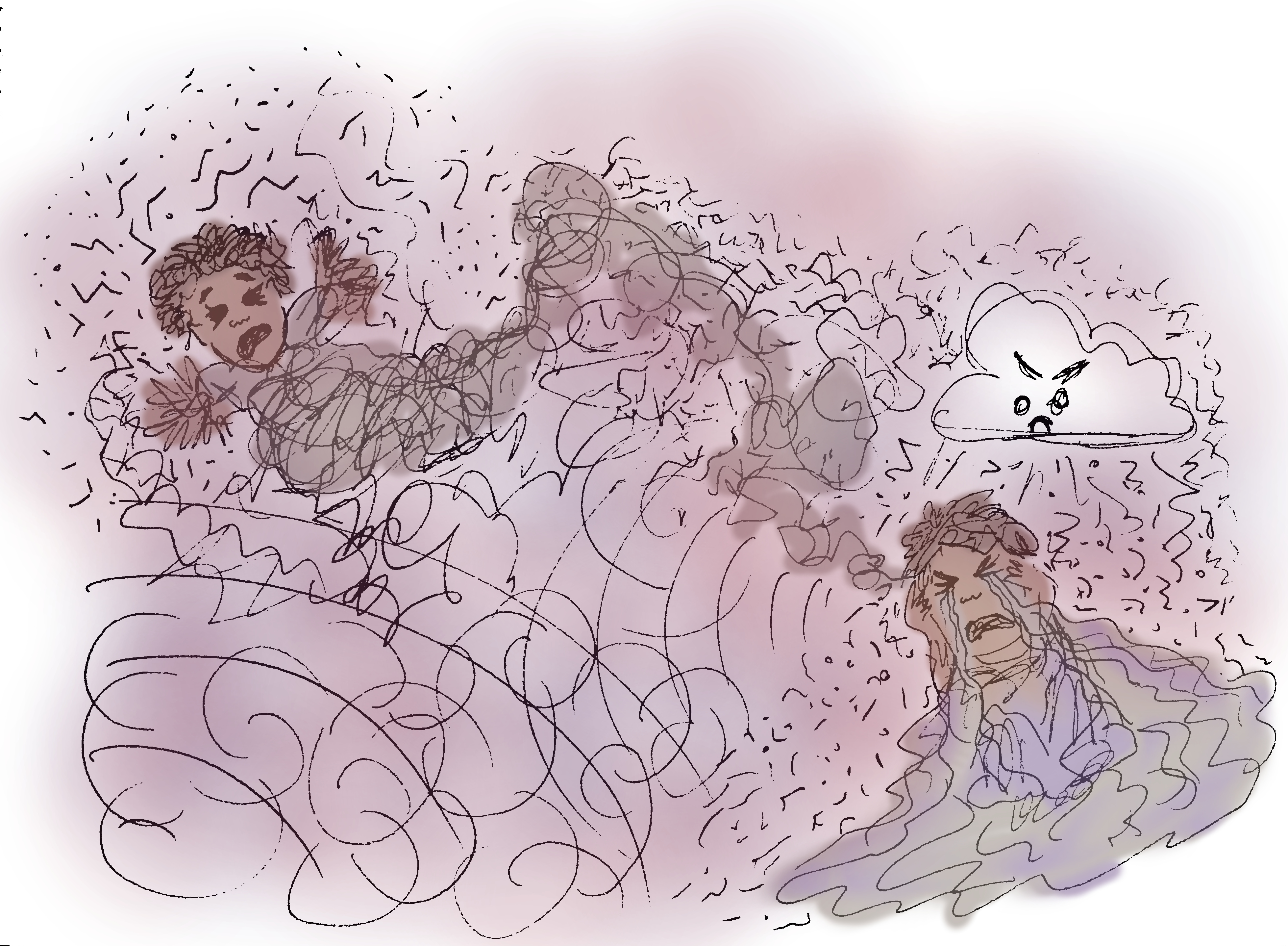 [image description: digital scribble of a panic-erupting me on the floor in a silver and purple-ish cry-puddle, angry cloud hovering, with a flying-running panicking-me above, lots of scribble swirl emotiony mark-things around the page on a purple and red and grey-ish misty background.]