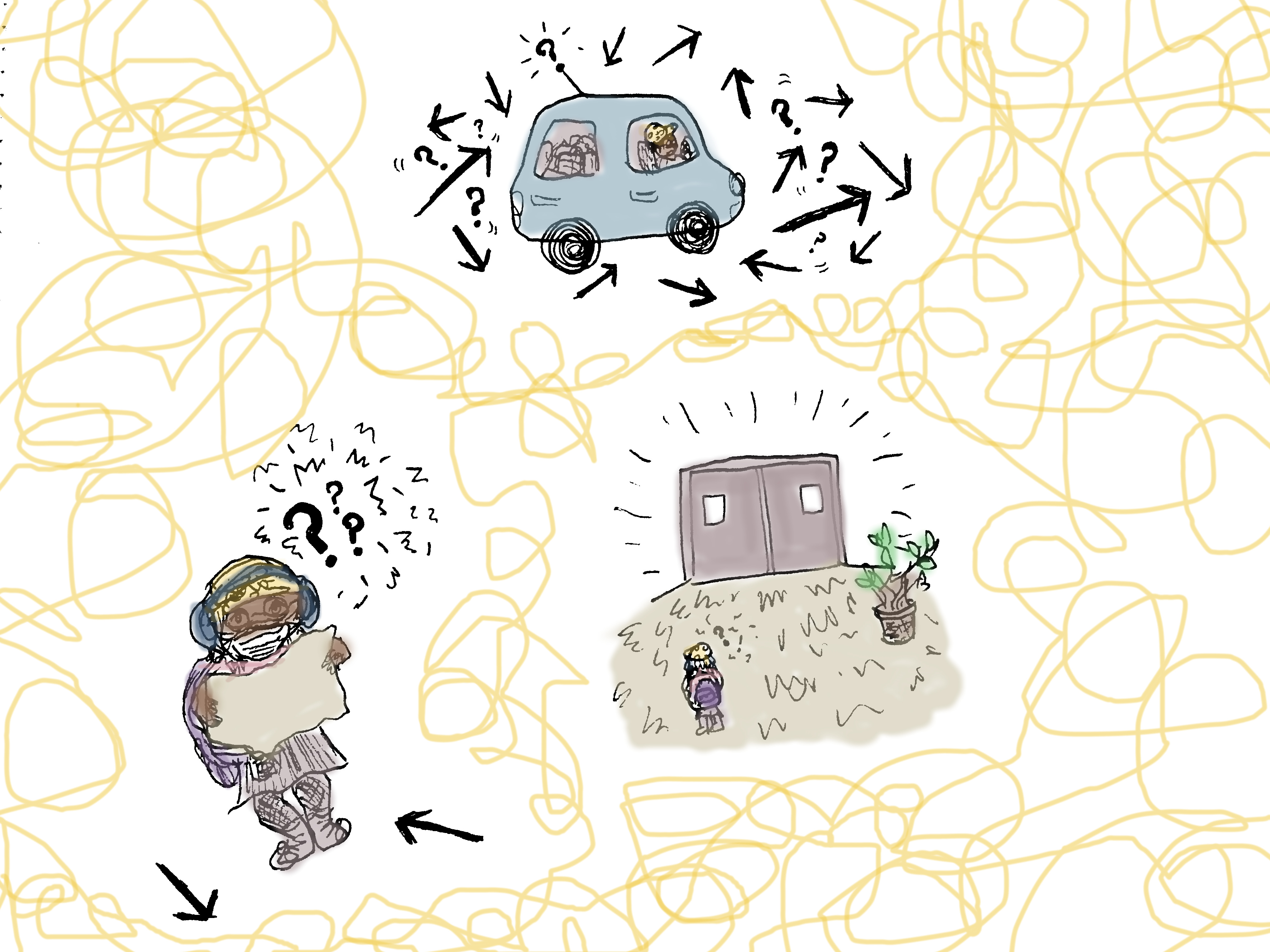 [image description: digital scribble-picture of me in the bag-filled blue car surrounded by arrowy things pointing in different directions and question marks. and then me standing staring at a map with scribbly question marks and emotiony-marks, with arrows on the floor facing different ways. and then me with my rucksack on facing some closed double doors with lines coming out of them – like something knows i just have to go through the doors but i’m just standing there stuck. there’s a plant in a pot outside it, scribbling things on the floor and a question mark near my head. yellow wooly scribbles in the background.]