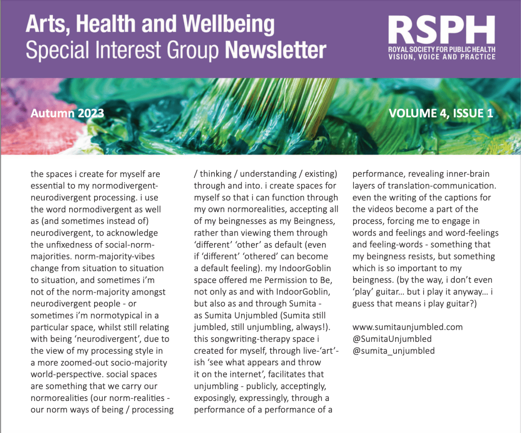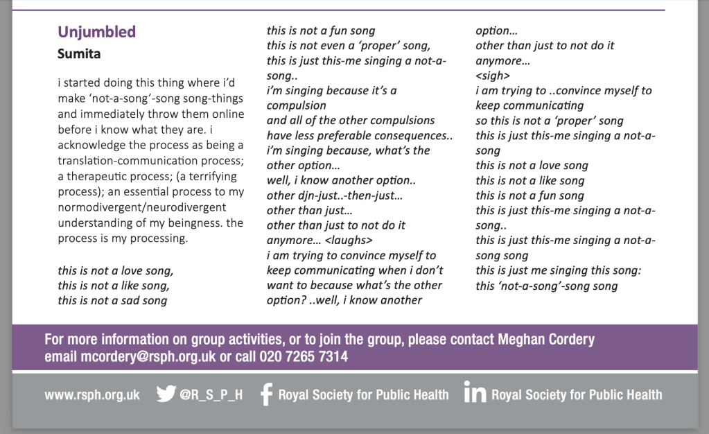 ‘Unjumbled’, in Royal Society for Public Health: Arts, Health & Wellbeing Newsletter (2023):